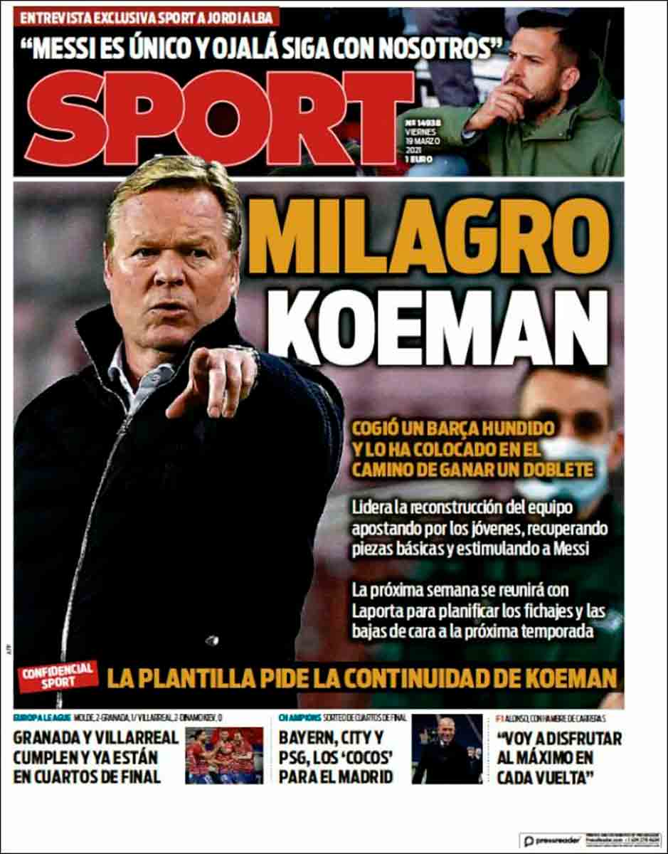 Sí, hombre, sí. Mirad bien. ¿Veis el faldón inferior, donde los amics de Sport apelotonan una miscelánea de asuntos menores? El de en medio de esos asuntos, y el que menos espacio tiene de todos ellos, es el sorteo. “Bayern, City y PSG, los cocos para el Madrid”. ¿Lo habéis encontrado? Lástima, no se suponía que teníais que hacerlo.