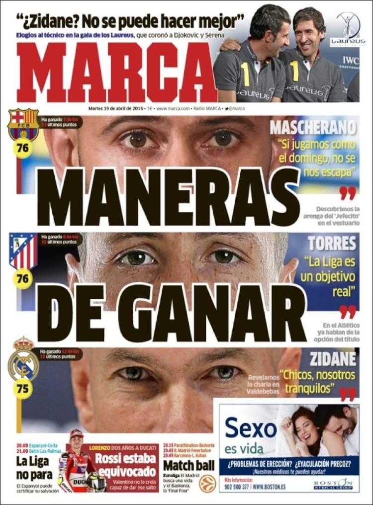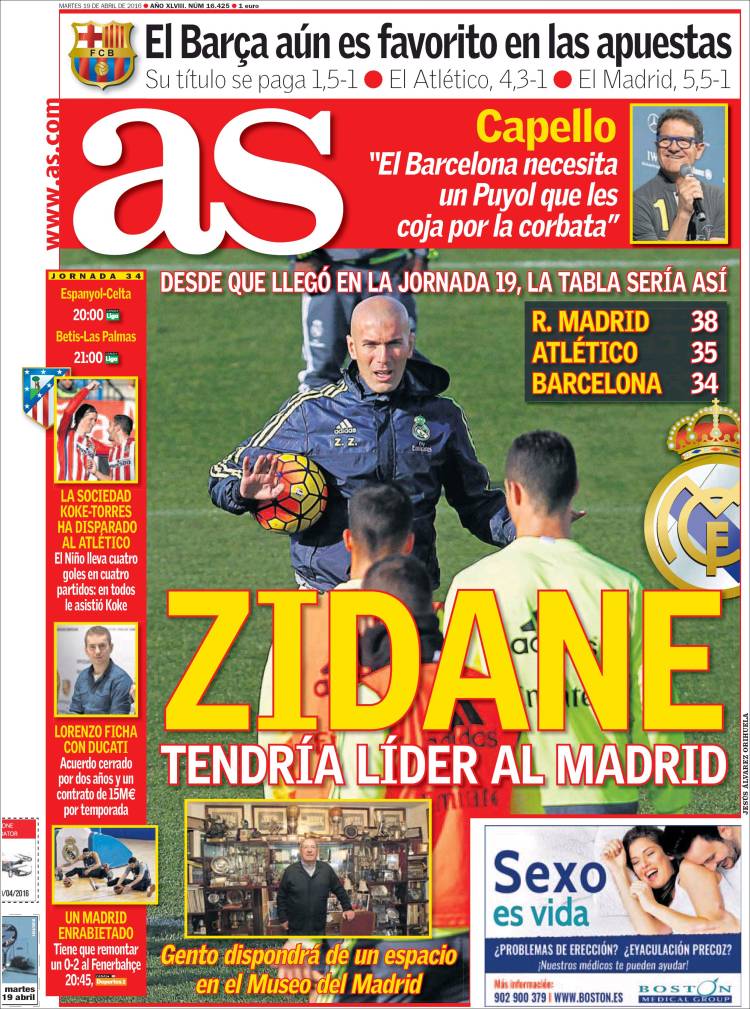 Mundo Deportivo regala un destornillador que vendrá muy bien a los de Sport por si quieren perder alguno más, Marca nos llena de inquietud al demostrar que los ojos de un delincuente confeso no difieren mucho de los de dos señores normales y As nos hace saber que si fuera por Zidane el Madrid iría líder. Esta última portada habrá llenado de un hondo pesar a algún periodista, que acaba de declarar en la radio lo siguiente: "A madridista no me gana nadie, pero no quiero que el Real Madrid gane nada", frase que constituye a la vez una valiente salida del armario y una perfecta verbalización de la separación actual del madridismo: están los madridistas que quieren que el Madrid gane (parece una perogrullada pero ya vemos que no lo es) y los madridistas que quieren que el Madrid pierda. No ponemos detrás del último "madridistas" uno de esos paréntesis llenos de signos de interrogación y exclamación porque os tenemos por personas muy inteligentes.