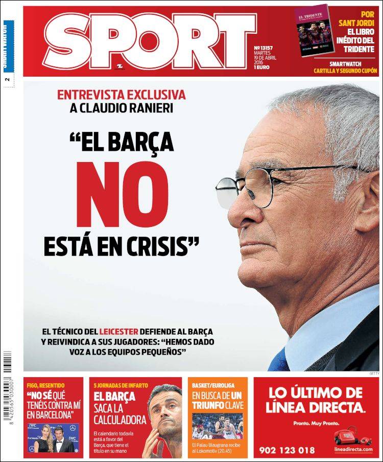 Buenos días. Sostiene Ranieri que el Barça no está en crisis. Nos informa de ello en su primera plana el diario Sport y, la verdad, nos deja muchísimo más tranquilos el saberlo. Decimos "el saberlo" y no "el leer esas palabras" o "el creerlo", y decimos bien, porque si lo dice Ranieri las cosas son así y punto.