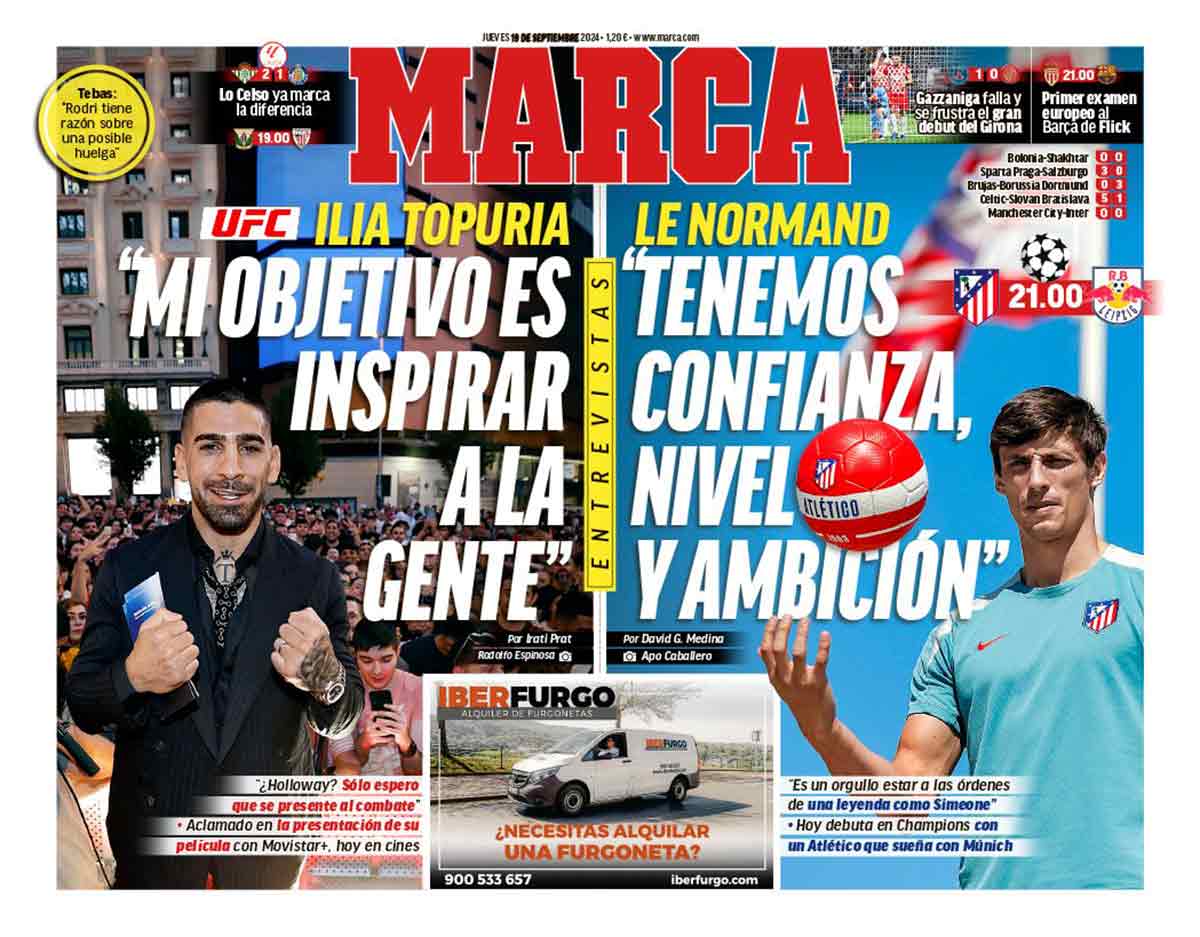 De la portada de Marca, lo más interesante es el contacto facilitado para alquilar una furgoneta. Aparecen el teléfono y la web en la parte central baja. Si la publicidad de la empresa de reformas que habéis recogido os ha dado la idea de meteros en obras, es probable que necesitéis un vehículo industrial. Y luego criticamos al diario de Gallardo, con lo útil que resulta.