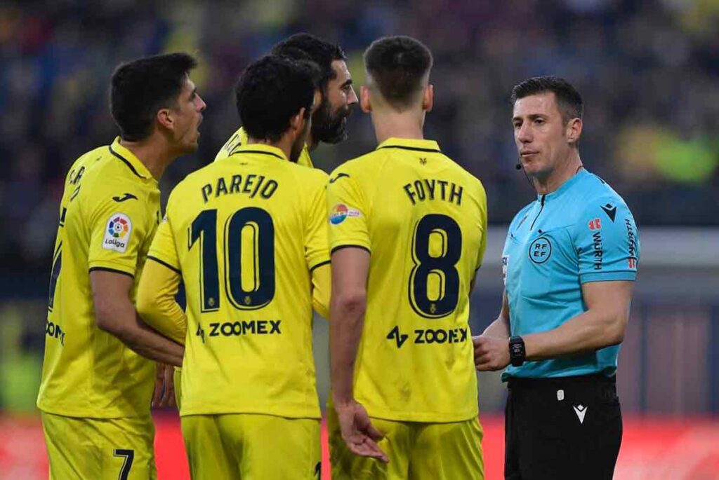 En la primera mitad el colegiado hizo un guiño a las fechas actuales de Reyes y los frecuentes regalos de juguetes. Había uno muy célebre llamado tragabolas. Hoy, el riojano, fue un tragacórners. En el primer acto se comió tres: dos a favor del Real Madrid y uno para el Villarreal. Además, en el aspecto disciplinario enseñó amarilla a Pau por un golpe en la cara a Militao en el 15'.