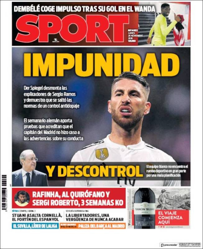 "Der Spiegel desmonta las explicaciones de Sergio Ramos y demuestra que se saltó las normas de un control antidopaje", suelta 'Sport' con insultante naturalidad. Nos está contando lo mismo que se contó el viernes, pero con imagen desaliñada del camero de fondo y un titular rimbombante a ver si así cala algo. Dice 'Sport' que el diario alemán "aporta pruebas de que el jugador del Real Madrid no hizo caso a las advertencias sobre su conducta", pero no dice en qué consistió esa conducta. Leyendo el artículo de `Sport' completo (alguien tiene que hacerlo, y La Galerna se sacrifica por vosotros), se descubre que Ramos decidió ducharse antes del control, algo que puede ayudar a orinar con posterioridad, cosa que no suele ser fácil tras un partido. El Reglamento no permite que tal cosa se haga a menos que se haga en presencia del oficial correspondiente, que es exactamente lo que sucedió. El camero se duchó delante del responsable del control y éste, tras ejercer de improvisado voyeur, lo consignó en el recuento oficial de los hechos. Este extremo da para anécdota casposo-homo-eróticofestiva en el mejor de los casos. Ni mucho menos para intentar sembrar dudas sobre la posibilidad de que Sergio se hubiera dopado, que es lo que con gran desvergüenza pretende dar a entender 'Sport'. A Sergio se le podrá reprochar una actitud innecesariamente altanera o unos hábitos de micción poco acordes con la reglamentación vigente. Nada más. Ni ha dado positivo en ninguna sustancia prohibida ni nada remotamente parecido. No existe por tanto la "impunidad" de la que habla 'Sport', con más cara que espalda.