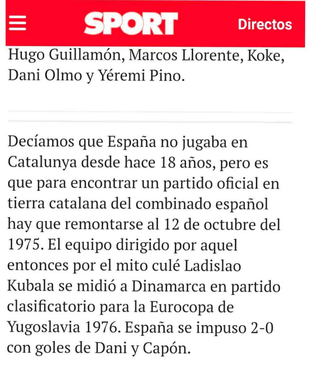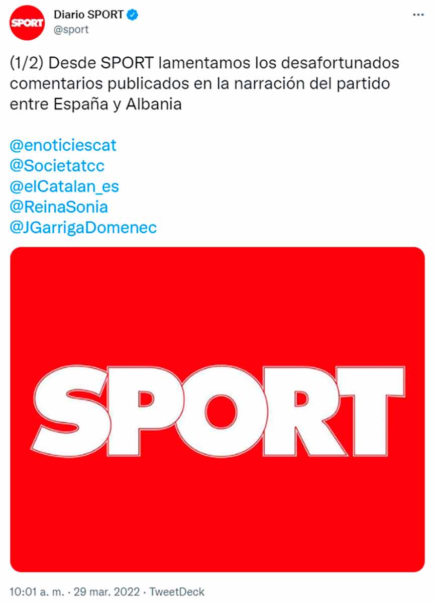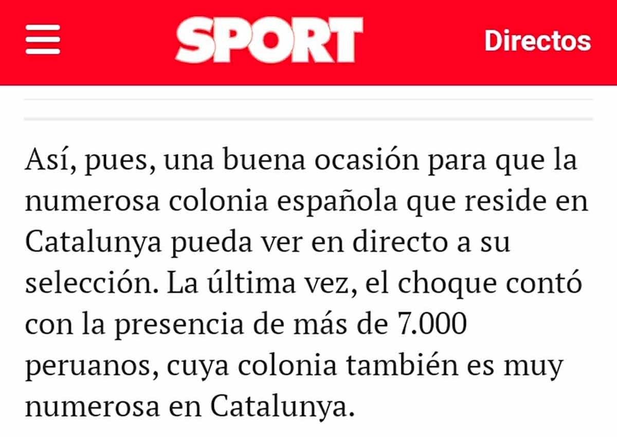 Buenos días. Sport es un diario español de prensa deportiva editado en Barcelona por Prensa Ibérica desde 2019, cuando esta adquirió el Grupo Zeta. Su director es Lluís Mascaró. Durante el directo del partido disputado por la selección española frente a Albania en el RCDE Stadium el pasado sábado 26 de marzo, publicaron en su web lo siguiente: “Así, pues, una buena ocasión para que la numerosa colonia española que reside en Catalunya pueda ver en directo a su selección. La última vez, el choque contó con la presencia de más de 7.000 peruanos, cuya colonia también es muy numerosa en Catalunya”. Esta es la captura:
