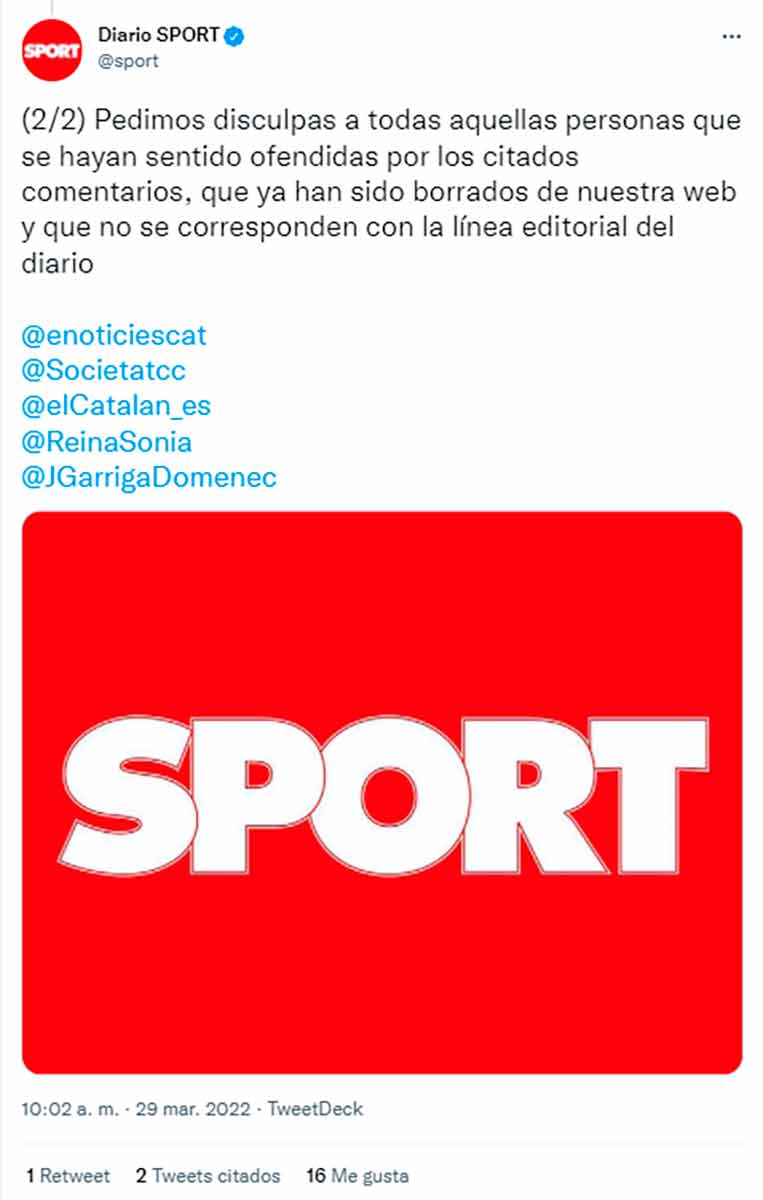 Las explicaciones y disculpas ofrecidas por Sport son las siguientes: