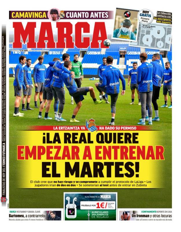 “¡La Real quiere empezar a entrenar el martes!”, nos sorprende la portada de Marca. El decreto del estado de alarma en su artículo 10.3 suspende la apertura al público de “las actividades deportivas y de ocio”, pero no queda tan claro lo relativo a los entrenamientos. ¿Se hará por el artículo 33? Marca nos aclara que “La Ertzaintza ya ha dado su permiso”, lo cual nos deja mucho más tranquilos sabiendo que la competencia para tal aprobación es única y exclusiva del Ministerio del Interior.