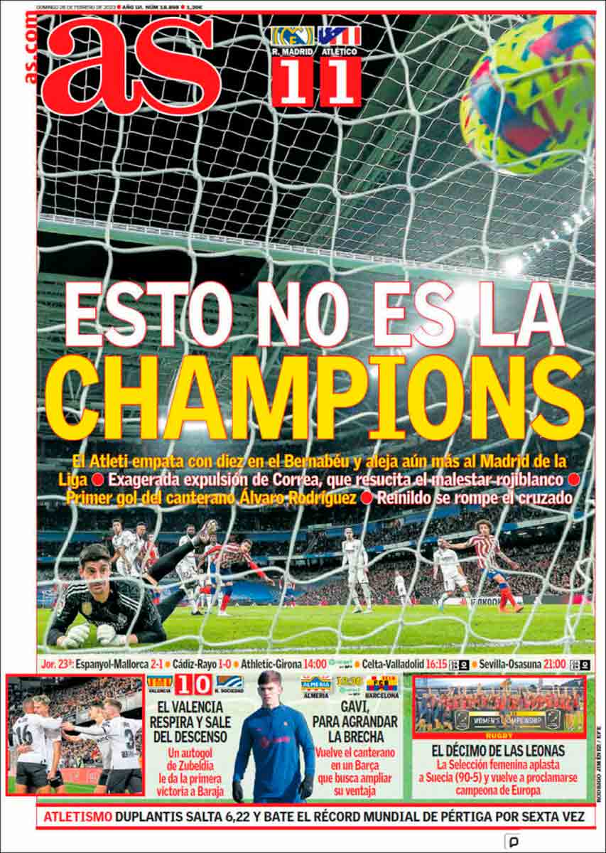 Y, sin embargo, se mueve. Sigue girando la rueda de hámster para que la sigan los hechizados por Hamelín, o por el diario As sin ir más lejos. Titula su portada "Esto no es la Champions" y tiene toda la razón. En la Champions alaban y aprecian el fútbol de Vinícius, que no se somete en cada partido a un acoso y derribo por parte de jugadores y aficiones rivales. En la Champions no suele haber más tarjetas que faltas, hito casi conseguido ayer por Gil Manzano, de cuya actuación nuestras portadas solo destacan la expulsión rigurosa de Correa y no, por ejemplo, la tarjeta amarilla a Militão nada más salir de la caseta y que, dada su posición sensible en el campo, pudo condicionar su actuación el resto del partido.