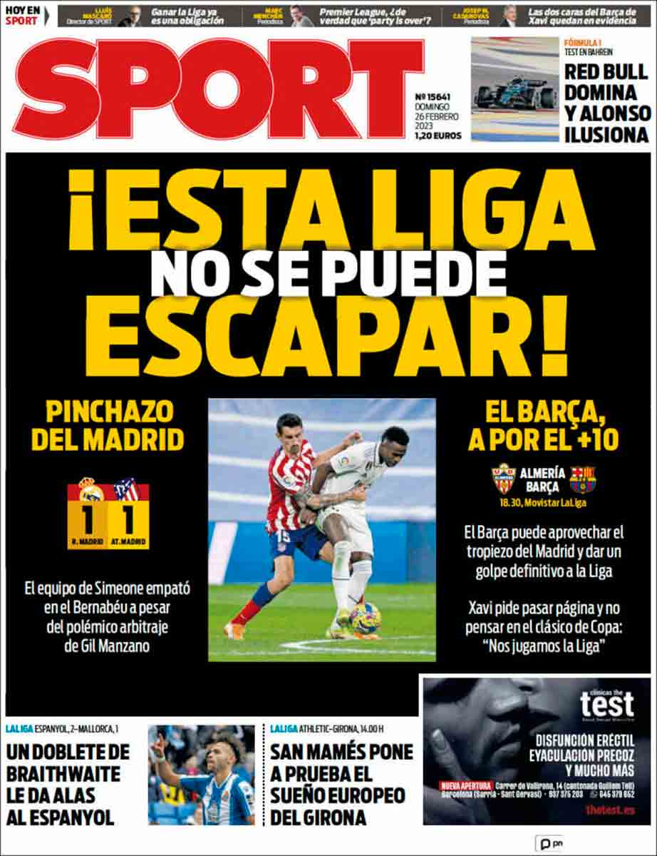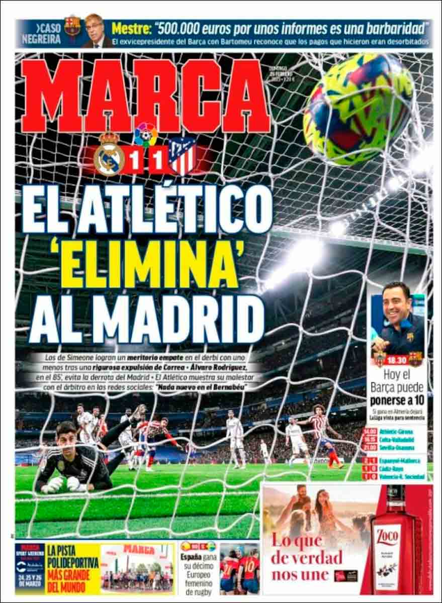 Las portadas de los 4 medios "de referencia" en deportes ya indican que todo vuelve a la "normalidad". Otra polémica absurda por una expulsión de un jugador del Atleti. A ese equipo le puede la condición y Correa suelta el codo al estómago de Rudiger sin jugar el balón y quieren que no pase nada. En fin, esta competición no tiene remedio. Y quieren parecerse a la Premier. Paradojicamente, la única esperanza de que algo cambie es que Roures parece que quiere saltar del barco antes de que se hunda o por lo menos tirar al grumete Laporta por la borda. Veremos...