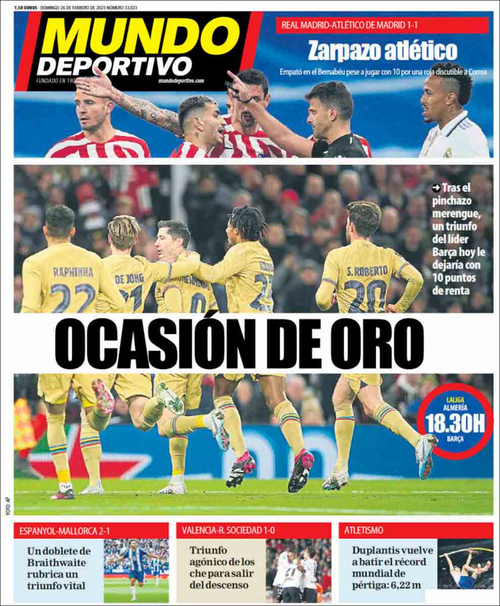Si Freud nos asistiera, el negro de la luna sería el negro que ilustra el fondo de la portada de Sport, sobre el que se lee "¡Esta liga no se puede escapar!". Qué maneras más curiosas tiene el inconsciente de salir a la luz y ya ser consciente para un observador atento. Es de oro la portada de Mundo Deportivo, tal vez por sublimación del negro negrísimo, mientras que podría sonar a implícita confesión la de su hermano Sport, quien podría estar reproduciendo, con imperiosas exclamaciones incluidas, una frase dicha en su momento a Negreira por vaya usted a saber qué presidente del Barcelona en vaya usted a saber qué año de los últimos veinte.