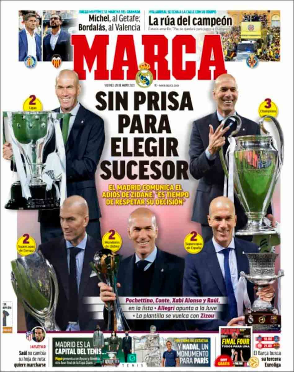 Una vez neutralizado Zidane, tras años de acoso mediático, el Marca nos ofrece una portada de despedida con todas las copas que ha ganado en sus dos etapas en el Madrid. A buenas horas.