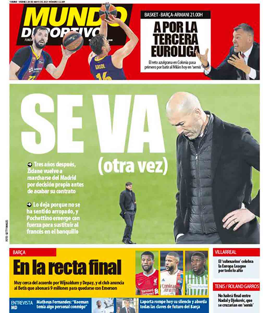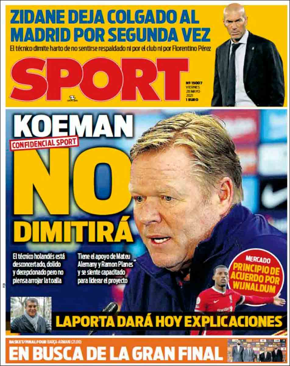 Sport se decanta por las cuitas de Koeman como argumento principal de su portada, pero por supuesto hay sitio para Zidane, que “deja colgado al Madrid por segunda vez” “harto de no sentirse respaldado ni por el club ni por Florentino Pérez”. A ver, Sport. O Zidane es un informal y un ingrato que deja tirado a su club, o Florentino es un sátrapa que abandona a su subordinado en medio de la tormenta, pero las dos cosas a la vez no. A veces hay que elegir qué hostia dar, por mucho que tengas las manos ávidas de propinarlas. Al final reiremos nosotros, Sport, ya lo veréis. El Madrid es muy grande. Mucho más, incluso, que Zidane.