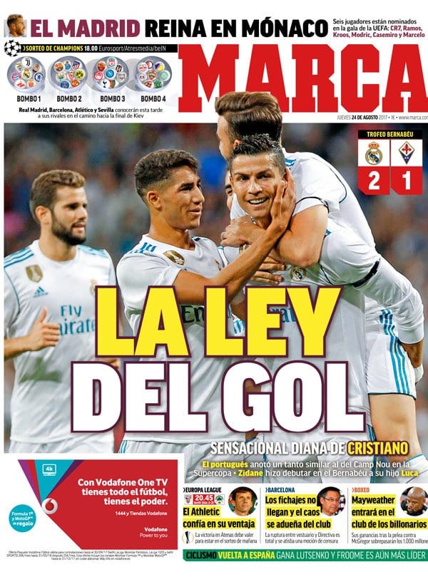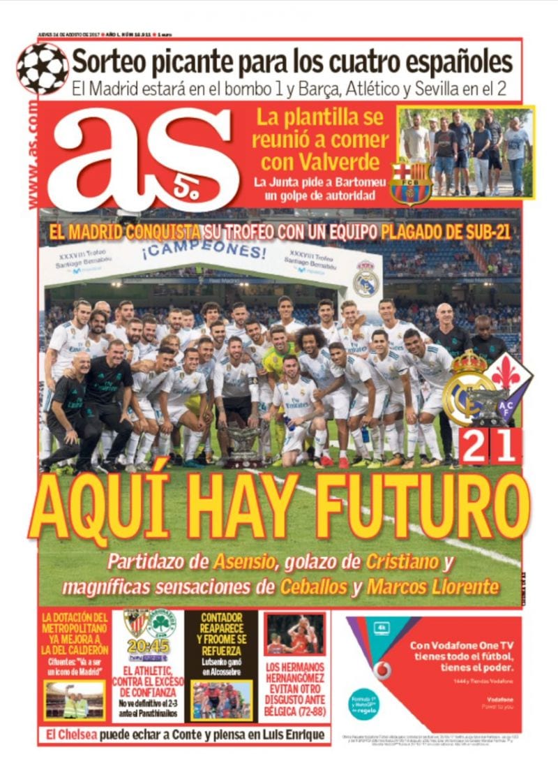 Todo ello lo resume Marca en un titular de quita y pon que tan pronto te vale para un partido contra el Getafe como para un apabullante 0-1 del equipo del Cholo en un campo azerbayano. Aquí hay futuro canta La Ouija con su sacerdotiso supremo profetizando en su púlpito. El Madrid que viene pero soltando su pellizquito de monja habitual como si, ni siquiera en noches así, pudiera evitarlo. Lean, lean su editorial y encuentren en él una nueva venganza del señor de las croquetas. Ya lo han visto. De los productores de Yo acusé al hijo de Mourinho en Canillas, llega Luca Zidane quiere ser portero. "El joven meta Luca pasó sus nervios", dice Relaño paternal a la par que comedido, mientras la edición digital de su diario asegura que su error es de aquellos que no olvida el Bernabéu.