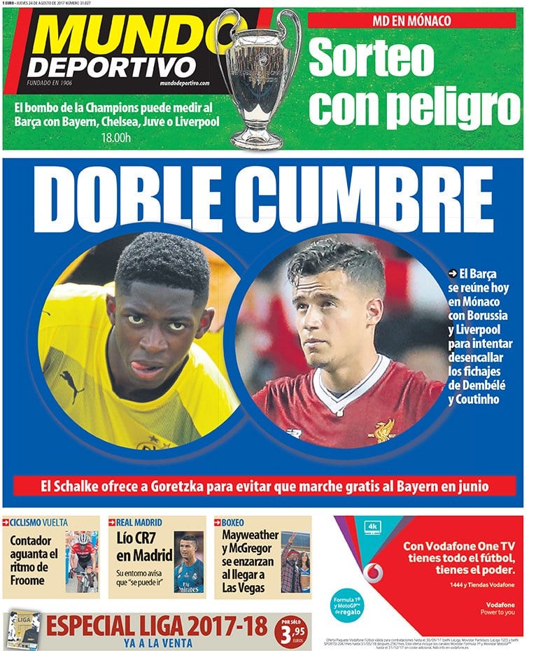Con estos precedentes cualquiera se fía. Allí uno se pasa a comprar fideos y le acaban encasquetando macarrones. Porque coincidirán ustedes en que insistir día sí y día también con Coutinho y Dembele como hace Mundo Deportivo es cuanto menos macarrónico.