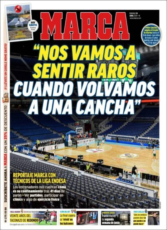 Así, raros, declaran sentirse también los entrenadores de la Liga Endesa en la portada de Marca, desprovistos de unas costumbres que, de algún modo, eran también las nuestras, costumbres suyas que nos implicaban, que nos mantenían sujetos a algo que hace bien poco llamábamos normalidad, tal vez sin saber muy bien con qué derecho y por qué motivos podíamos llamar normal a algo. Hasta ese punto estamos raros estos días, amigos.