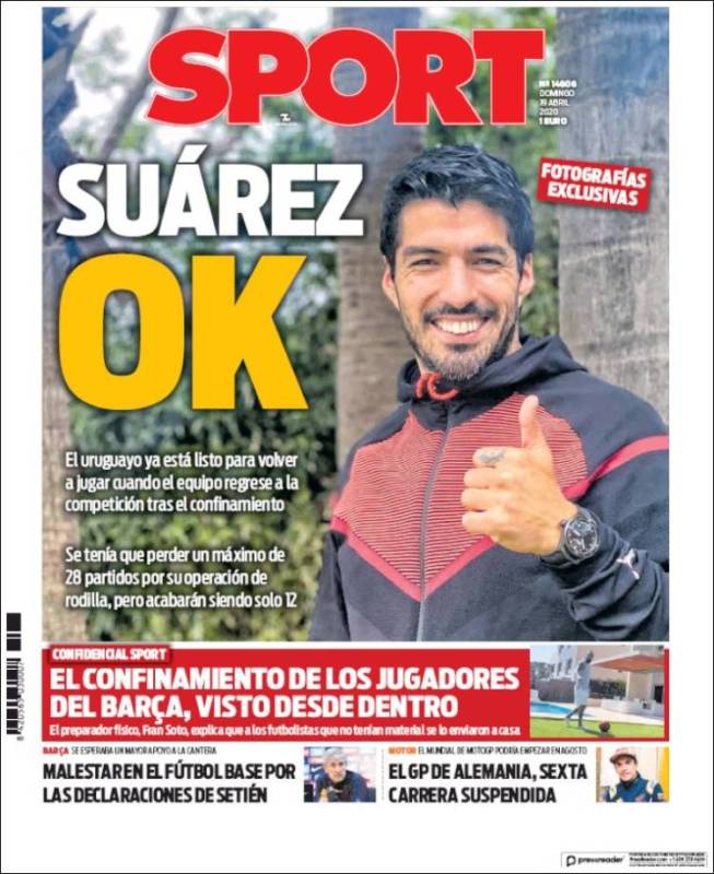 Les pedimos perdón si pensamos que el regreso de Luis Suárez a los campos de fútbol nos da entre igual y lo mismo, ni fu ni fa, ni frío ni calor, aunque parece que Sport, aferrado también a sus costumbres, celebra que el delantero uruguayo no vaya a perderse los 28 partidos inicialmente previstos, sino solo 12. Sin duda, tenemos que pensar que ha olvidado Sport el motivo de esa brusca reducción de partidos de ausencia. De recordar el motivo, suponemos que no se hubiera atrevido a celebrar tal cosa en una portada.