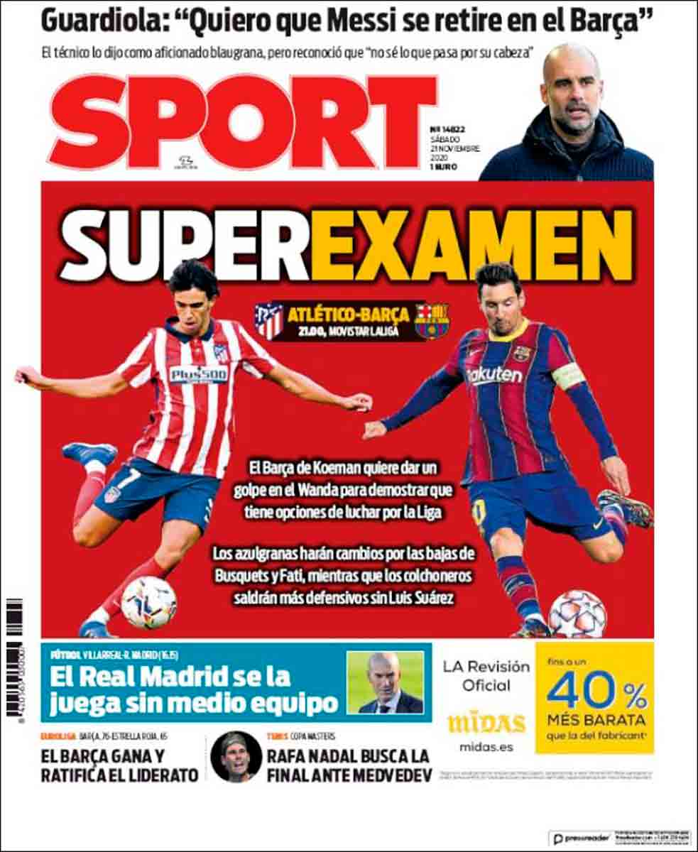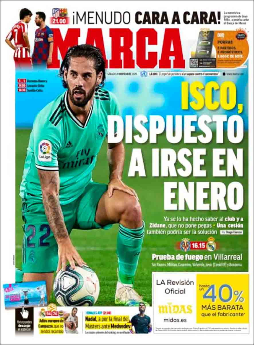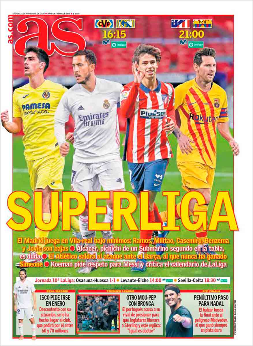 Tampoco sabemos si para As será sin Isco un poquito menos SUPERLIGA, que suena como a competición de la Marvel. En As son muy aficionados a los superhéroes. A todo lo súper. En As, ya lo sabéis, son mayormente expertos en superportadas como la que nos ocupa, aunque no sería esta, ni mucho menos, uno de sus grandes éxitos. Aparece Messi ladeado, con Hazard y Joao en el centro. Tiene incluso el astro argentino una manita fuera de la portada. Esa fotografía parece la de Marty McFly y sus hermanos, la misma que se va borrando mientras él permanece en el pasado. Messi está ahí, pero parece como ido en ese segundo plano a la espera de que le arranque, o de que le arranquen (para lo que no parecen muy dispuestos), el Delorean. Está la SUPERLIGA y tres noticias de tamaño idéntico: Lo de Isco, que aquí no es disposición sino petición, un rifirrafe (seguramente exagerado) entre Mou y Pep en Inglaterra, y el gran Nadal, siempre con la disposición perfecta.