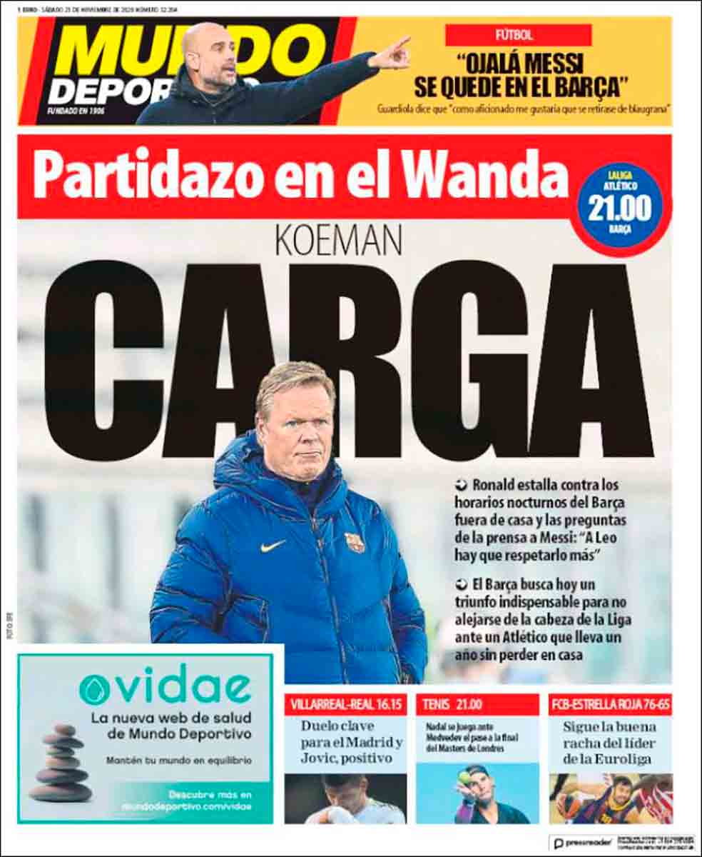 En cuanto a la disposición de los medios cataculés observamos un victimismo exagerado. Pobres. Todo le sale mal al Barça y no es por su culpa, por supuesto. Aunque es extraña la portada de Mundo Deportivo. KOEMAN CARGA. Es rara. ¿Qué carga? ¿el cuerpo? ¿la pistola? ¿la cerbatana? ¿el tirachinas? ¿del izquierdo? ¿del derecho? No, no. Hay que leer la letra pequeña, como en los contratos. Koeman carga contra los horarios nocturnos y las preguntas de la prensa a Messi. Acostumbrados al prime time y al masaje tailandés diario a Cuchitini es de entender esa carga. Por el gesto de Ronald podría preguntarse también si lo que carga es un gargajo, pero no lo haremos así de buena mañana por si dijeran que sí. En Mundo Deportivo son capaces de todo. Hasta de intentar hacer que nos creamos la frase de San Pep: “Ojalá Messi se quede en el Barça”. Amén.