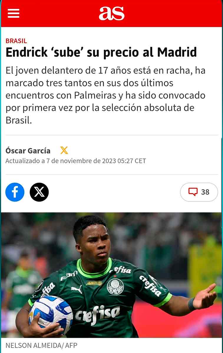 As también destaca la convocatoria de Endrick con la selección absoluta brasileña. El jugador más joven jamás convocado por la canarinha, por delante de Ronaldo y Pelé. Pero este hecho también es malo, porque anda el Madrid por medio. Si no juega porque no juega, si no anota porque no anota, si marca porque es más caro. Todo mal.