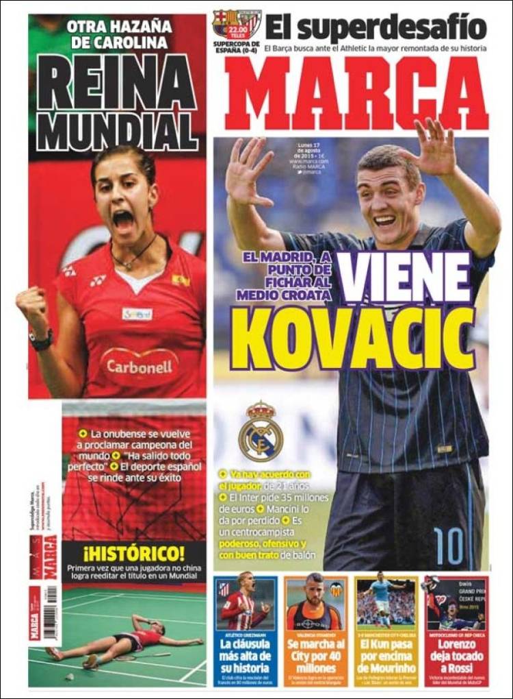 Marca se hace eco hoy del notable éxito de Carolina Marín, pero le concede más espacio al inminente fichaje de Kovacic por parte del Madrid. No dejamos de ver la injusticia de tal extremo, si es que atendemos al esfuerzo muy poco reconocido que seguro hay detrás de las victorias de la campeona de bádminton. Ocurre, sin embargo, que esta injusticia no torna en justicia solo porque un día llegue Carolina (o un regatista, un atleta, un karateca...) a las portadas. Mucho nos tememos que serían necesarios muchos más días y cambios más profundos para que la sobreabundancia de noticias (?) futbolísticas no opaque otras historias dignas de mención, aprecio e interés. Así que ya ha quedado dicho: zapatero a tus zapatos, galernauta a tu galerna.