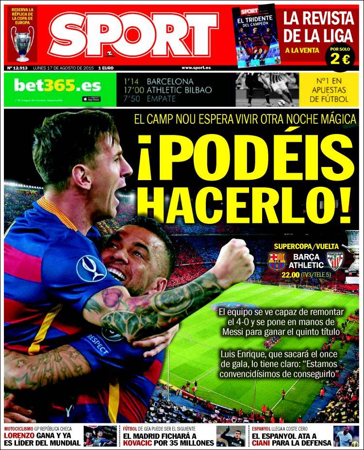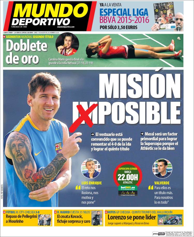 Si en un alarde de lecherismo centralista el diario As centra su portada en la Supercopa, cómo no iba a hacerlo la prensa catalana. Eso sí, Mundo Sport, Sport Deportivo o simplemente Sportivo no puede hacer gala de equilibrio informativo, ya que su esforzada tarea es la de arengar, querer, desear, impulsar, motivar y todas esas cosas que el coaching triunfante recomienda. Es Messi el recurso principal -el clavo ardiendo- al que se agarra el barcelonismo para ver como posible una "noche mágica" de remontada. Messi sonriente y pleno de tatuajes, Messi eufórico abrazado a Dani Alves, Messi incluso como el Ethan Hunt de Misión Imposible, título al que en Mundo Deportivo han tachado la partícula negativa para convertir la tarea en realizable. Entendemos el recurso al crack argentino, pues esta noche es una ocasión ideal para que saque su mejor juego y su mayor efectividad, pero -aun siendo tal vez injusto- nos alegramos de no desayunar cada mañana con una foto de Cristiano en las portadas de la meseta, aunque solo sea porque (Laporta nos perdone) estamos más cómodos no siendo més que un club, sino nada más (y nada menos) que un club.