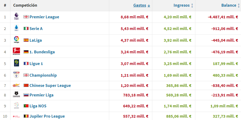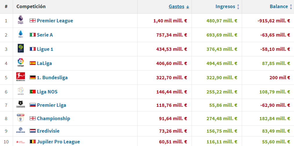Así ha sido en prácticamente todos los países, reduciéndose significativamente las compras con respecto a otros años. Solamente la Premier Inglesa ha relanzado la economía, con algunos fichajes de alto valor, aunque inferior a cantidades de otros años. El gasto de la Premier es equivalente al de las siguientes ligas que más han gastado (liga española, italiana y francesa).