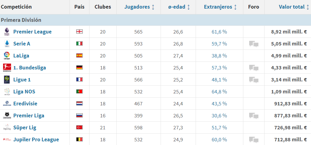 Desde hace años, la Premier league se está convirtiendo en una liga mucho más potente que el resto, con una diferencia abismal, que repercute en el valor acumulado de sus jugadores y en las cantidades que se pagan de traspasos.