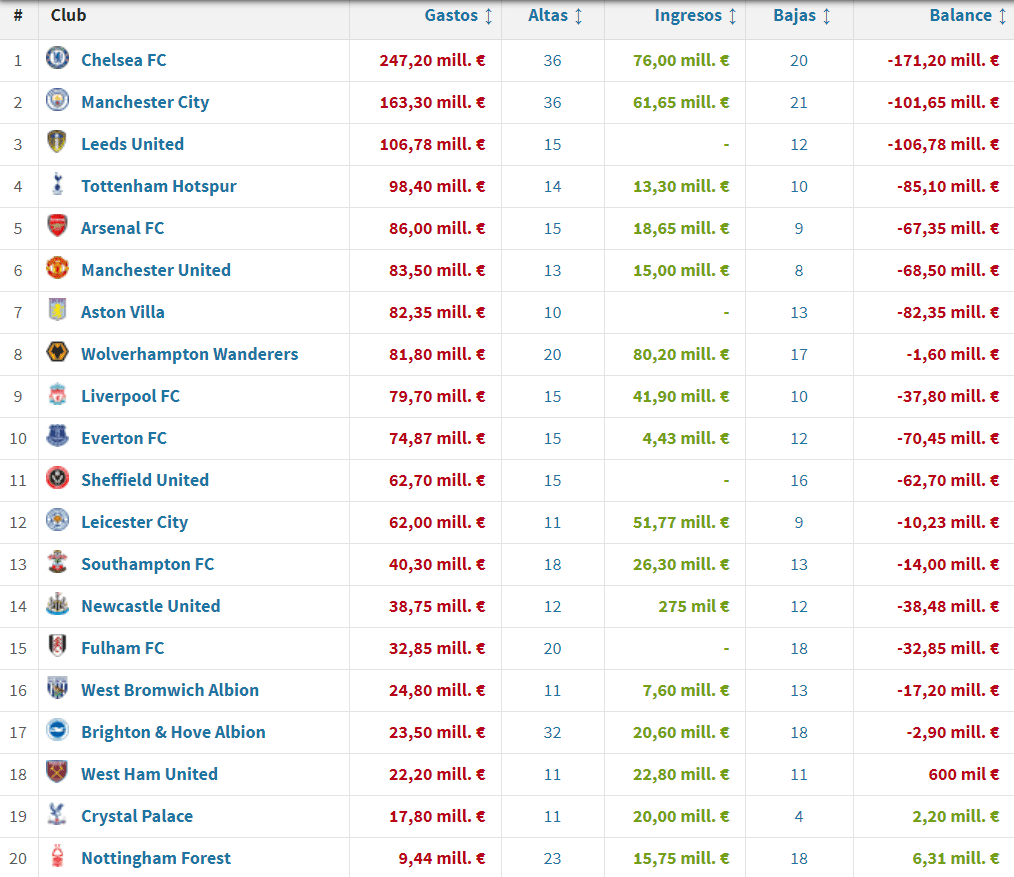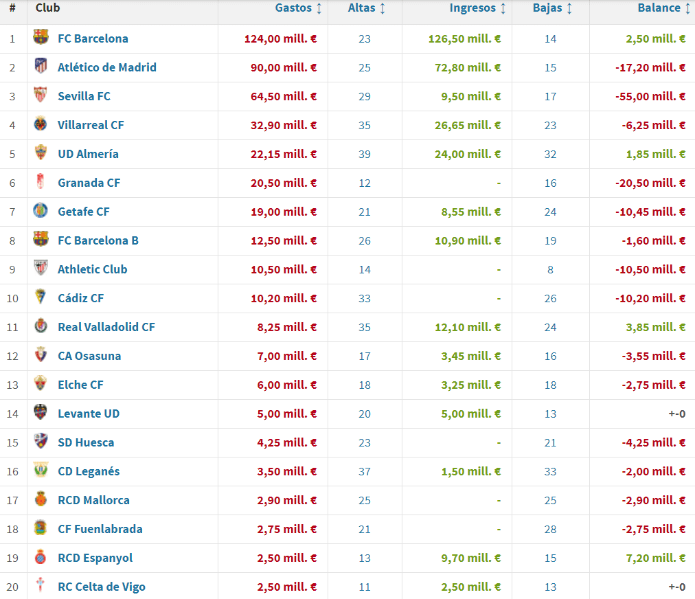 Mientras que la mayoría de clubes españoles han ingresado más de lo que han gastado, apostando por una política muy conservadora de ahorro, o con pocos gastos, en el caso inglés, la dinámica es justo la contraria, como se aprecia en sendos gráficos.