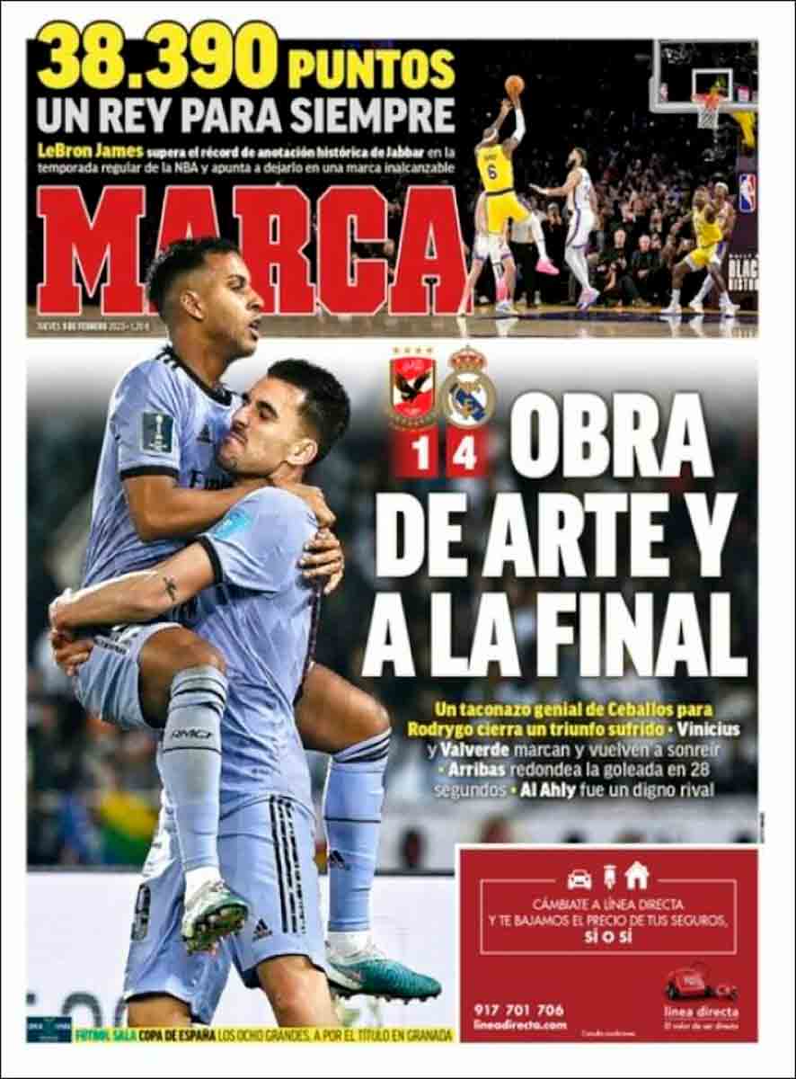 Abajo, “La pegada del Madrid le mete en la final en otro partido muy gris”. Se aprecia con claridad que lo han escrito con algo contundente atorado entre la tráquea y esófago. El recurso ridículo de la pegada denota madriditis aguda.