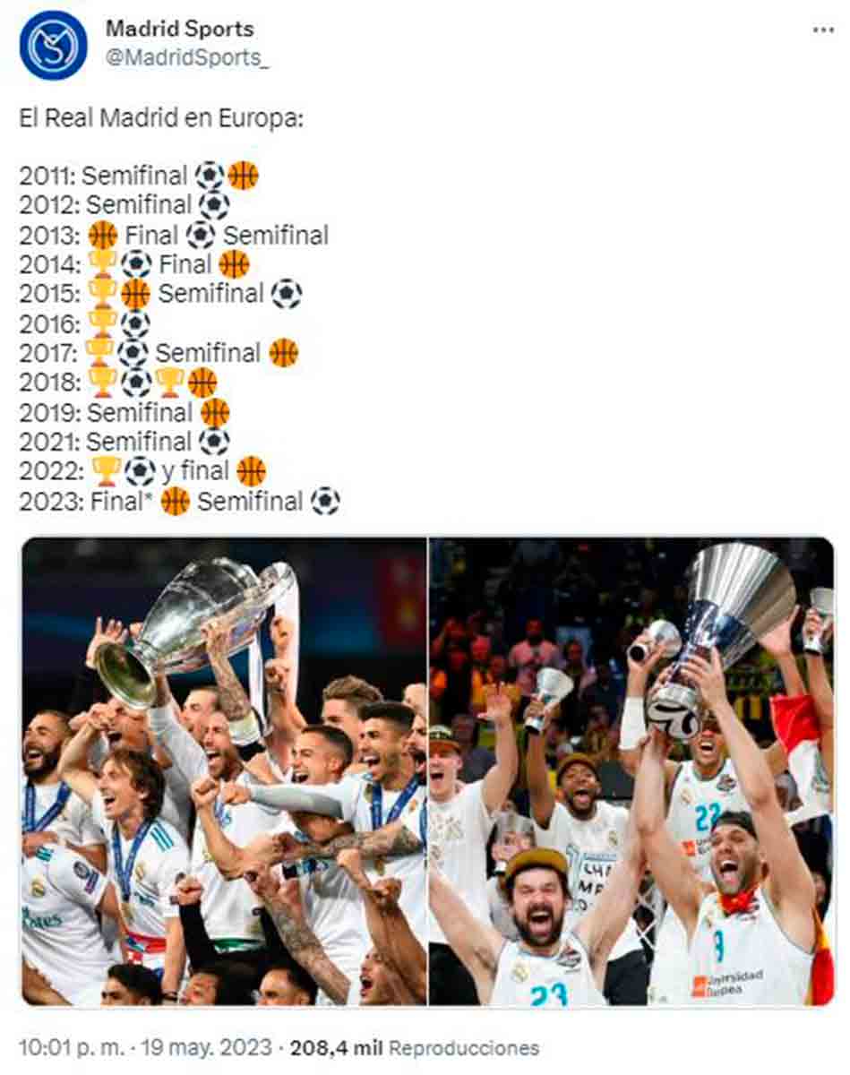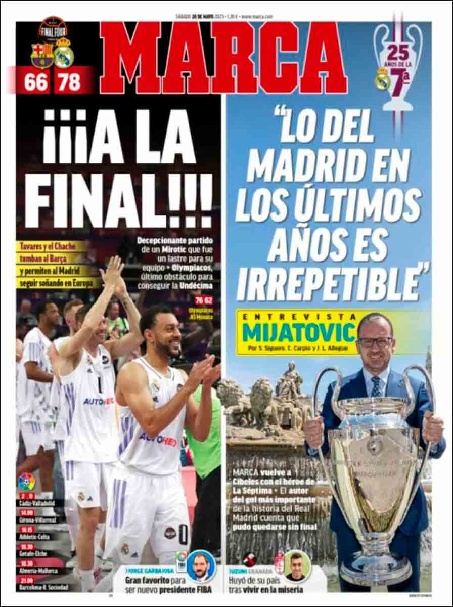 “A la final”, titula Marca con varios signos de admiración, una frase que entronca a la perfección con la de Mijatovic que la acompaña: “Lo del Madrid en los últimos años es irrepetible”. Pues sí, tanto en la sección de fútbol como en la de baloncesto. Como recordaba ayer un tuit de @MadridSports_.