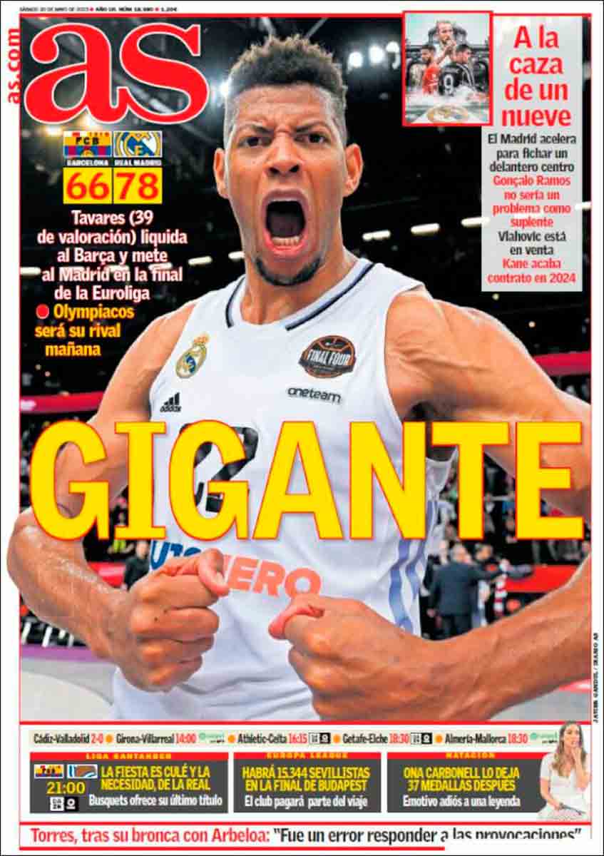 Bien el diario As por traer a portada el baloncesto en un día de victoria (recordemos que “casualmente” solo aparecía en las derrotas) y bien por ofrecer la portada casi íntegra al gigante caboverdiano Walter Tavares, quien ayer se despachó en un partido descomunal a Vesely, Sanli, Nnaji y a todo el que pasara por la zona madridista: 20 puntos, 15 rebotes, 3 gorrazos y 39 de valoración, como destaca la portada. Inmenso. Gigante. Un gigante que empequeñeció al jugador mejor pagado de Europa, Nikola Mirotic, quien, al acabar el partido dijo: “Es el peor día de mi carrera”. No es por hacer leña del árbol caído, o quizás sí, pero recordamos algún otro peor día de su carrera, como aquel -1 de valoración en la final de la ACB de 2020 contra Baskonia, o como aquella final de Euroliga de 2013 cuando, en el lado correcto de la historia y con la camiseta blanca frente a Olympiacos, acabó por los suelos y con la moral totalmente comida por unos griegos que le hicieron varios ídem.