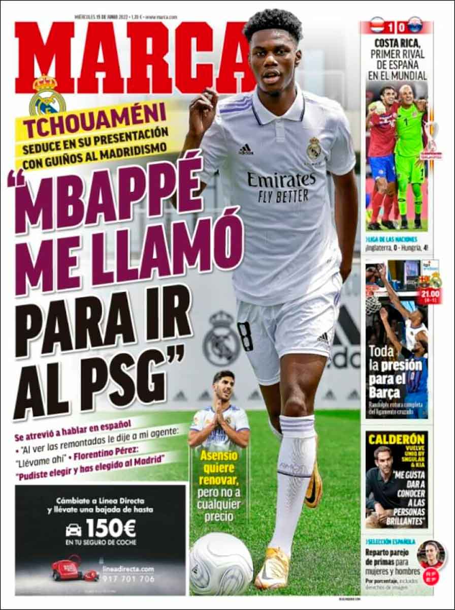 Marca se deja llevar por el morbo de la mención a Mbappé, consecuencia a su vez del morbo de los periodistas en la rueda de prensa. Nos parece comprensible, aunque nos gustaría que el madridismo mediático (¿?) y sociológico pasara página sobre el asunto Kylian. Tchou admitió que la estrella del PSG le había llamado para persuadirle de unirse a las filas hidrocarburescas, pero que fue un intento baldío. “Quiero dejar huella en el fútbol, y el mejor lugar para hacerlo es el Real Madrid”. Así es. ¿Qué clase de huella puede uno dejar en el PSG? La huella de uno que entra en el supermercado con los zapatos sucios, esa es la huella que se puede dejar allí.