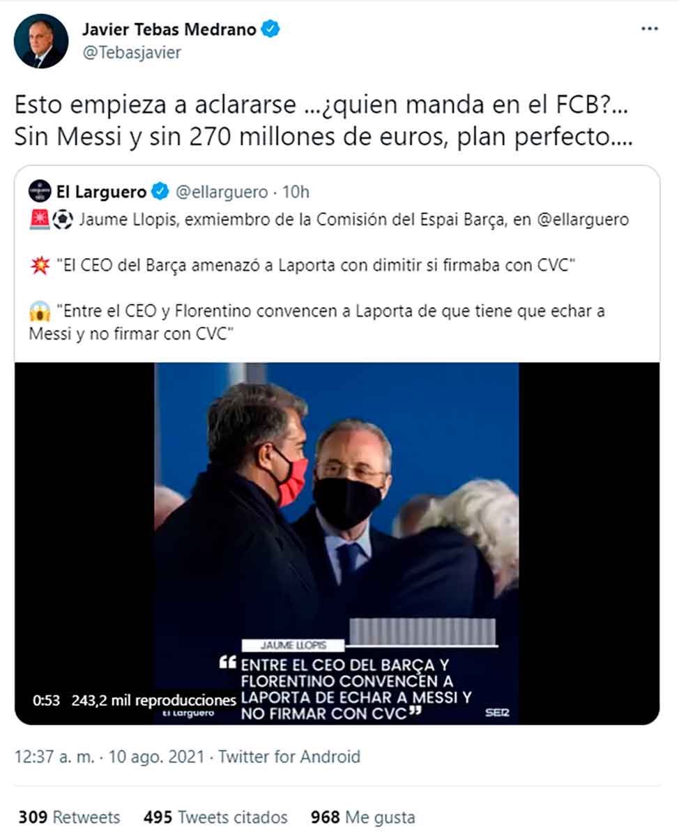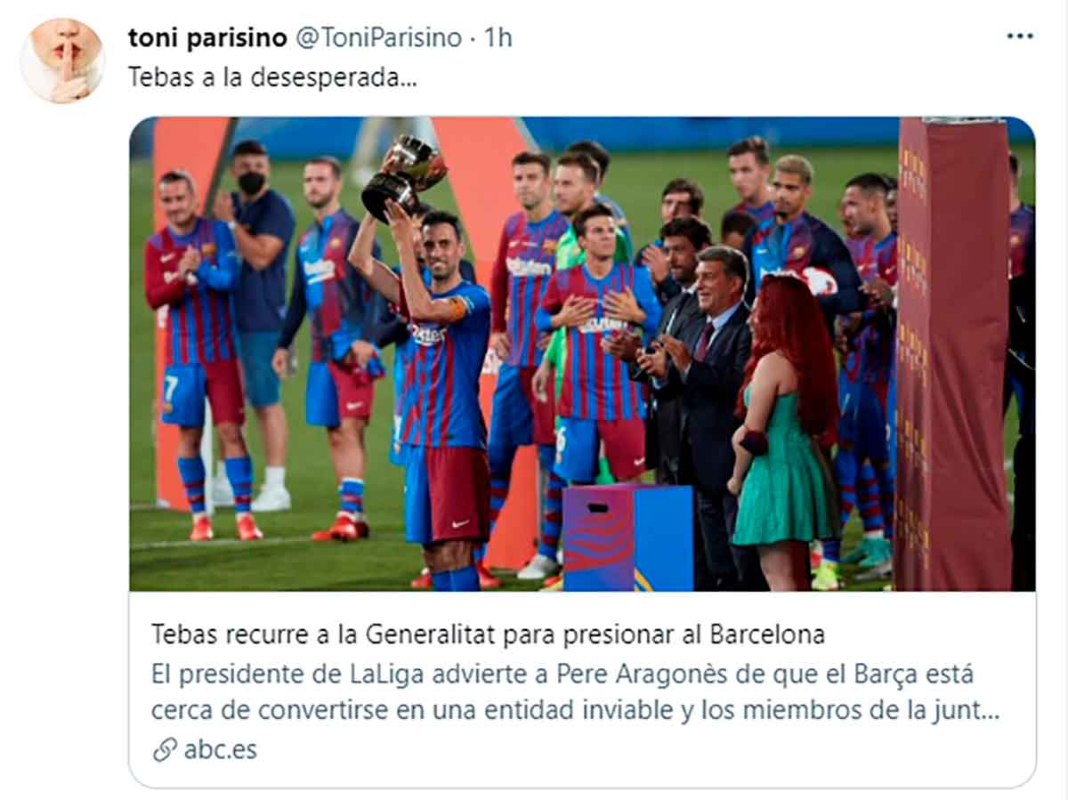Y no solo sigue con la pataleta, sino que ya va a la desesperada y recurre a la Generalitat para presionar al Barça. Les avisa que están cerca de convertirse en una entidad inviable y los miembros de la junta podrían perder el aval que depositaron. No sé a vosotros, pero a nosotros esto nos suena a amenaza. Además, el Barça actualmente ya es una entidad inviable, y la responsabilidad es del organismo regulador que ha permitido que se llegue a esa situación; Es decir, de la Liga, presidida casualmente por Tebas.