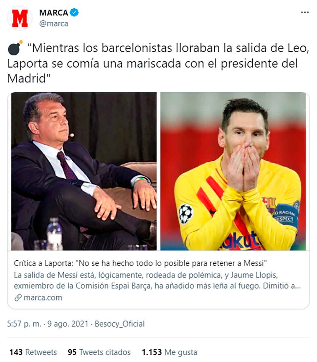 Tampoco tienen desperdicio las declaraciones de Jaume Llopis, exmiembro de la Comisión Espai Barça, que bien podría haberlas realizado un prepúber postberrinche tras marcharse su ídolo futbolístico del club de su alma. Las recoge Marca en el siguiente tuit: