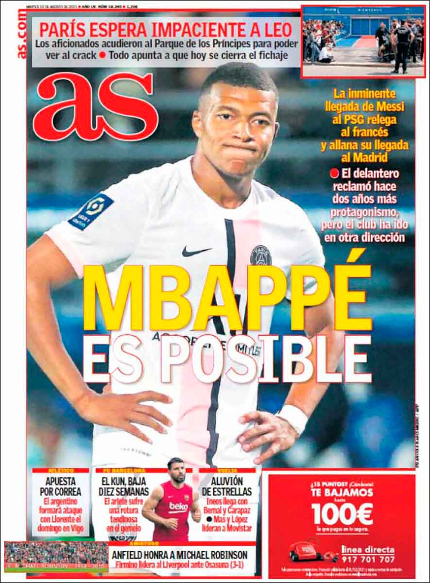 As da con la clave del tema Mbappé: además de indicar que es posible (que lo es), destaca que el delantero reclamó hace dos años más protagonismo y todas las acciones del PSG desde entonces van en otra dirección. La llegada de Messi supondría meter otro gallo más en el corral, justo lo que Mbappé no desea. El francés prefiere liderar un proyecto de un gran club en el cual él sea la estrella. Pues blanco y en botella, bueno, blanco y en camiseta: el Real Madrid.