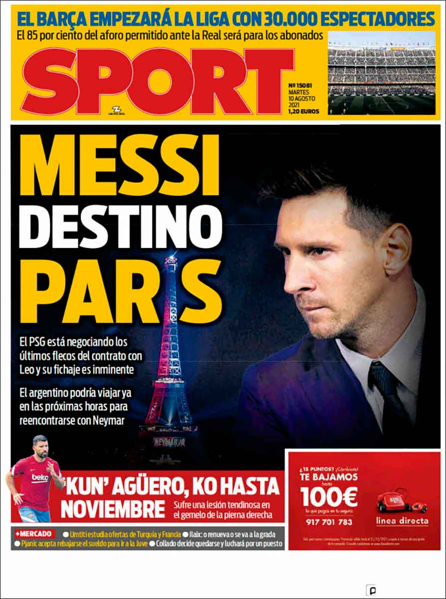 Sport asegura en su portada que el destino de Messi es París e indica que el PSG está negociando los últimos flecos del contrato. Entendemos que son los últimos flecos de la alfombra mágica del jeque, que le llevará al argentino volando a la capital francesa para que pueda seguir allí ganando los emolumentos que él, en su perfecto derecho, quiere seguir cobrando. Es igual de lícito seguir en el club de tus amores cobrando mucho menos (Messi podría haberlo hecho), que querer seguir con tu sueldo en otro lugar. Cero críticas a Messi por esta postura.
