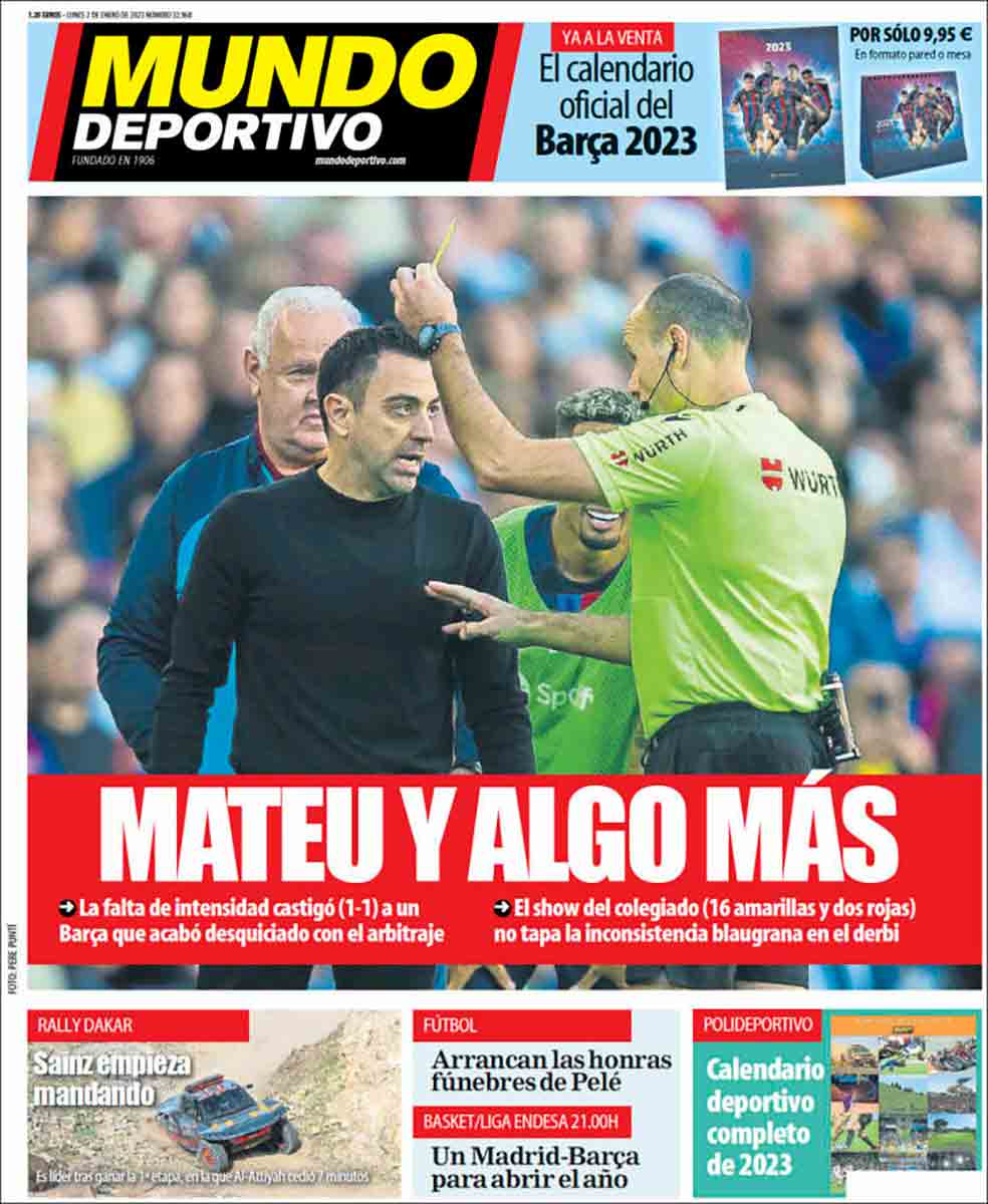 Como hace Sport, Mundo Deportivo da cuenta del fiasco culé, cargando las tintas contra Mateu Lahoz, que en la foto aparece sacando la amarilla a un Xavi cada día más parecido al Padre Apeles y menos a Clint Eastwood. Después del beso llegó la tarjeta, pues es el amor una montaña rusa de éxtasis y decepción continua que solo el matrimonio es capaz de hacer desembocar en el pantano calmo y proceloso de la rutina.