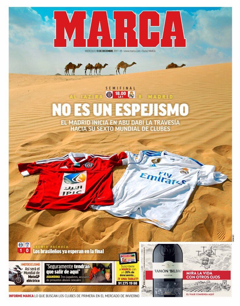Por último, y ya centrándonos de nuevo en ese Mundial de Clubes, queremos felicitar a 'Marca' por su bellísima portada. Puro fútbol, con un toque de ingenio y fantasía que nos hace tener, si cabe, más ganas del partido que esta tarde jugará el Real Madrid.