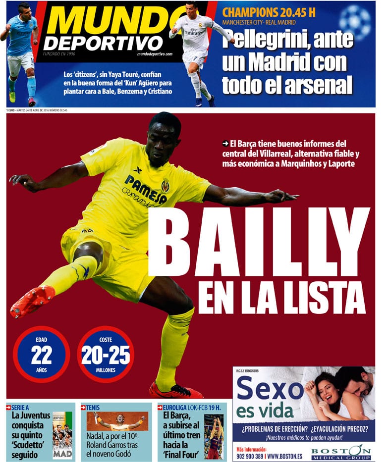En cambio, la primera plana de Mundo Deportivo es un poquito menos tronchante en lo cuantitativo, en tanto en cuanto el espacio dedicado al choque europeo de hoy es, aun siendo muy residual, un punto menos ridículo. Pero la noticia (¿?) escogida para hacer sombra informativa a lo que va a pasar esta noche a partir de las 20,45 es para mear y no echar gota (expresión que tampoco entendemos muy bien, ignorantes como somos entre la correlación de los problemas prostáticos y el sentimiento de sorpresa). Bailly está en la lista. Suponemos que se refiere a la lista de EDDACCR (El Director Deportivo Antes Conocido Como Roberto, hoy por hoy Robert por efecto de la corrección política catalana que arrasa con nombres y marcas por mucho que ya hubieran hecho fortuna castellanizadas). Tal cual suele espetar nuestro colaborador Antonio Hualde cuando algo se la sopla muy mucho, no sabéis cómo nos alegra. Nos alegra lo de Bailly, pero más aún nos regocija, amigos de MD, que hayáis optado por un McGuffin de tan alarmante falta de enjundia para distraer al espectador sobre lo esencial, y lo esencial es lo que pasa en el Etihad de Manchester.