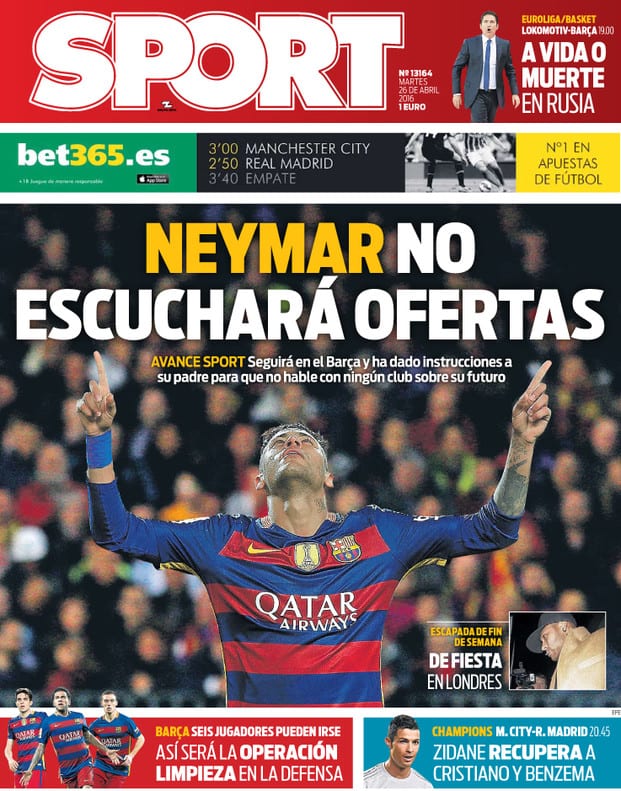 Poca queja tengo yo hoy contra Sport y MD. Son diarios para culés y una portada sobre la Champions quitaría las ganas de muchos de sus lectores de comprar la edición de hoy. El titular del Sport es más objetivo que el del MD aunque en un espacio más reducido, pero más no les podemos pedir. Por cierto, hoy se juega el Barça Lassa la Final Four y el MD da un rinconcito más pequeño y el Sport ni siquiera lo menciona, quedáos con lo bueno ;).