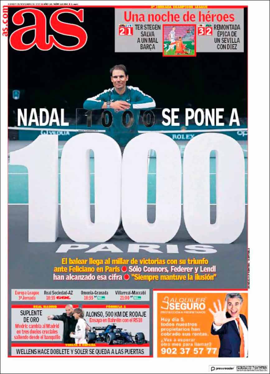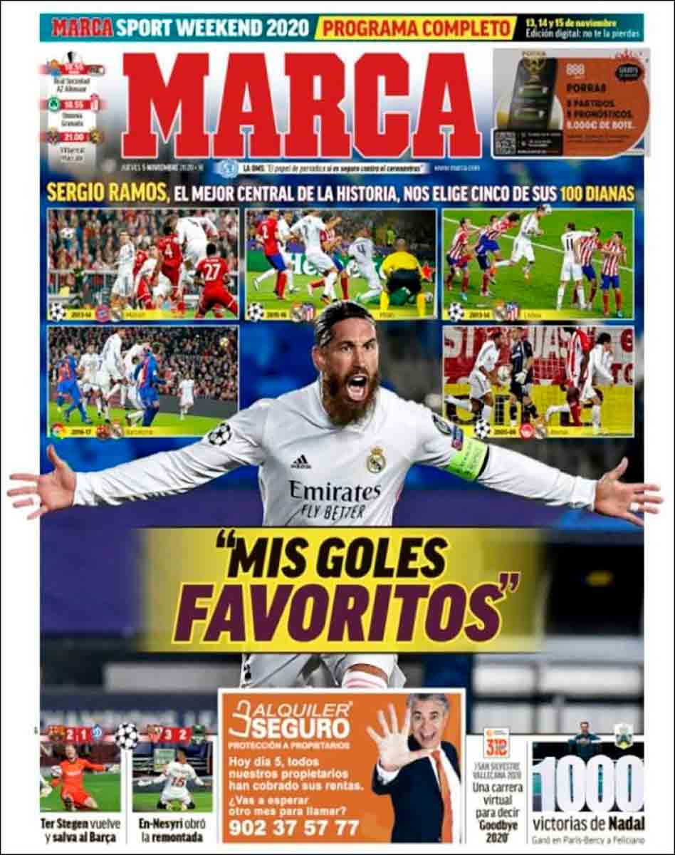 Por lo demás, Marca homenajea a Ramos por sus 100 goles (ya lo hizo ayer La Galerna doblemente, por medio de Ramón Álvarez de Mon y Athos Dumas) y As hace lo propio con Nadal. Justo y necesario en ambas instancias.