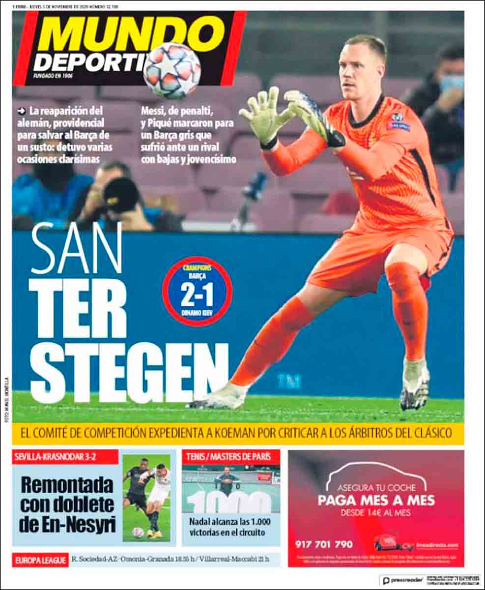 Buenos días. Titulamos hoy esta sección citando palabras de Gerard Piqué al término del encuentro ante el Dinamo de Kiev en el que su equipo, a la sazón el FC Barcelona, venció con muchísimos apuros. "El equipo está como está". La traducción exacta de esta frase debería leerse como "Estamos en la B financiera e institucional, además de ser una completa mediocridad en lo deportivo", cosa que eufemísticamente ya viene a reconocer, por ejemplo, la portada de Mundo Deportivo. El diario de Godó, grande de España, brinda todo el justificado protagonismo a Ter Stegen, que salvó a los culés de una derrota cierta de no haber intervenido su portero varias veces, con oportuno acierto.
