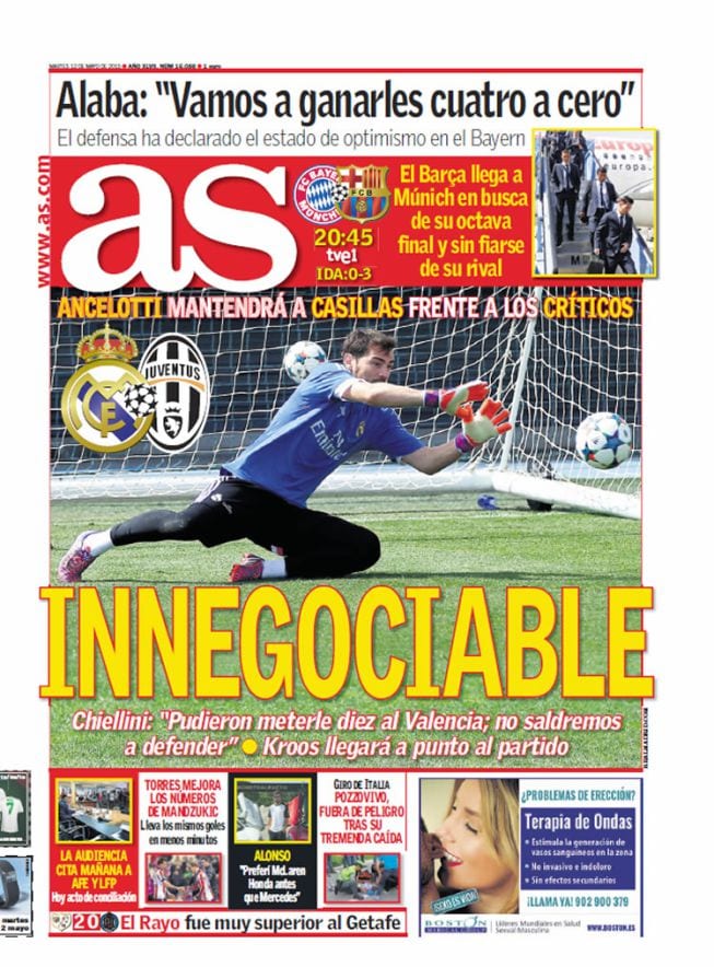 Por lo demás, hay en la portada noticias que son tranquilizantes y otras que se quedan en el intento de serlo. En el último apartado contabilizaremos las cuentas cosmético-proféticas de Alaba en la parte superior. En el de las noticias genuinamente tranquilizadoras, apuntamos la recuperación de Kroos. Lo de Chiellini constatando que el Madrid pudo meterle diez al Valencia es tranquilizador para Chiellini: sigue teniendo dos ojos en la cara.