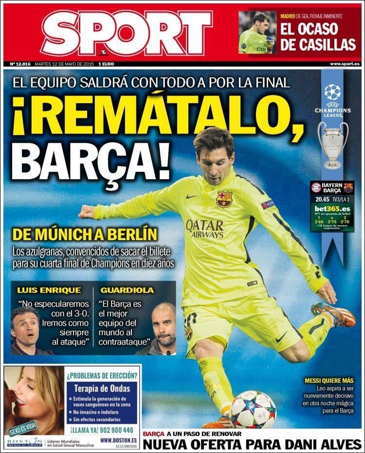 En consonancia con el subidón que prevemos si como todo el mundo espera eliminamos a la Juve, las portadas de hoy contienen abundantes metáforas de gloria nocturna, pero también mañanera.