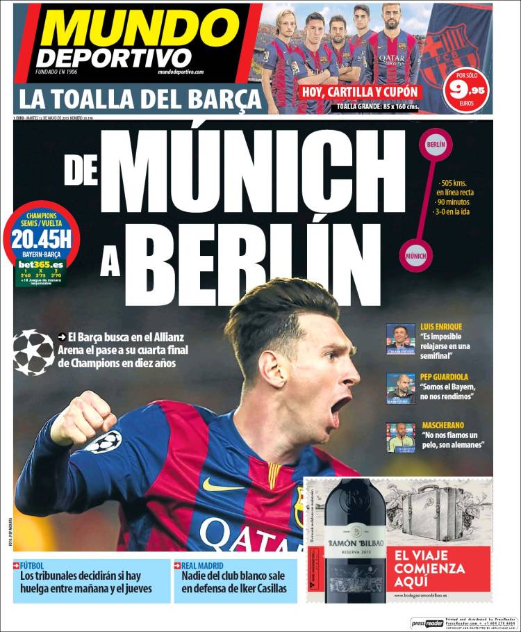 Mundo Deportivo sale con las incipientes entradas de Messi a cinco columnas. También trae un bosquejo de la ruta Munich-Berlin completamente innecesaria, nos parece, en este mundo donde Google maps es una aplicación que está al alcance de cualquier iPhone.
