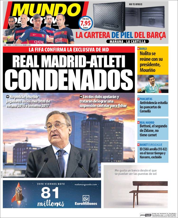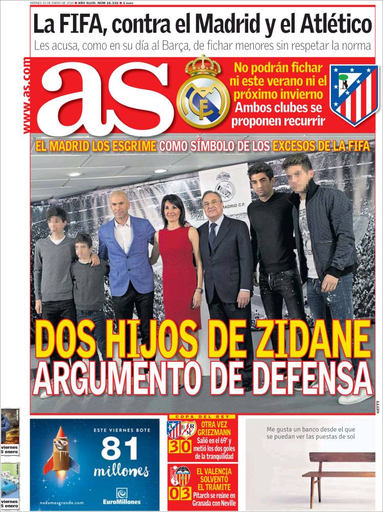 The Daily Ouija y su director aseguran que el club los exhibe como símbolo de los excesos de la FIFA pero son ellos quienes colocan todos los focos sobre estos muchachos, en aparente riesgo de exclusión social como abundaba ayer jocoso en Twitter el maestro Kollins. Resulta sorprendente cómo la edición digital de AS abre a estas horas tempranas con un asunto mucho más interesante que el de su edición en papel, una vez más convertida en una suerte de ‘Sálvame’ antimadridista. As.com informa de una denuncia anónima como artífice de la sanción de la FIFA contra Real Madrid y Atlético.