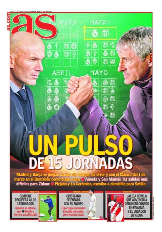 Ya en el continente, en As nos pretenden colar, directamente, sin preámbulo ninguno, a lo Roncero, un supuesto pulso entre Zidane y Setién, en el que Zizú parece mirar más bien a la teta de Julieta, mientras Quique parece escudriñar con envidia el apolíneo perfil de su émulo madridista. Seremos nosotros, pero, cualquiera diría que, en As, el periódico madridista por antonomasia, intentan equilibrar una balanza ahora mismo rota.