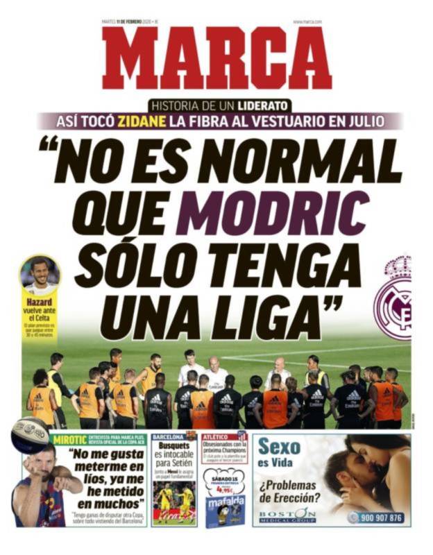 Hoy en Marca nos hablan de una arenga (esta sí parece verdadera) de Zidane a los suyos: “No es normal que Modric sólo tenga una Liga”. Palabras son del mes de julio, parece ser, que presentan en el contexto de “Historia de un liderato”, como si ese primer puesto del Madrid en la tabla fuese un suceso extraordinario, que lo es, sin duda, también en el otro contexto imaginario y proceloso de “Historia de la Liga” en los últimos años, período casi medieval de oscurantismo, tan sólo heroicamente iluminado por cuatro blanquísimas Copas de Europa, Mundialitos, Supercopas y una Liga tan sonora como una bofetada.