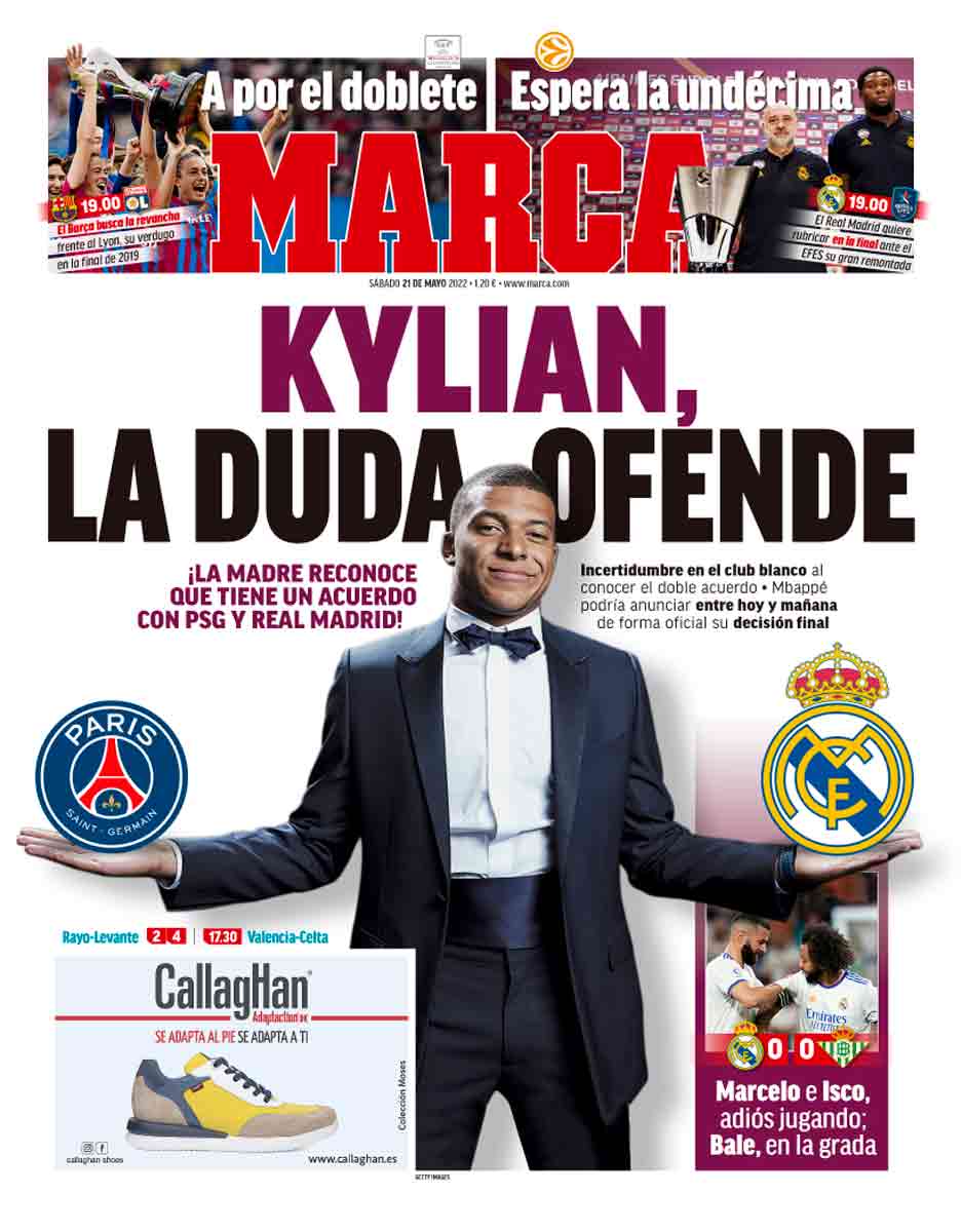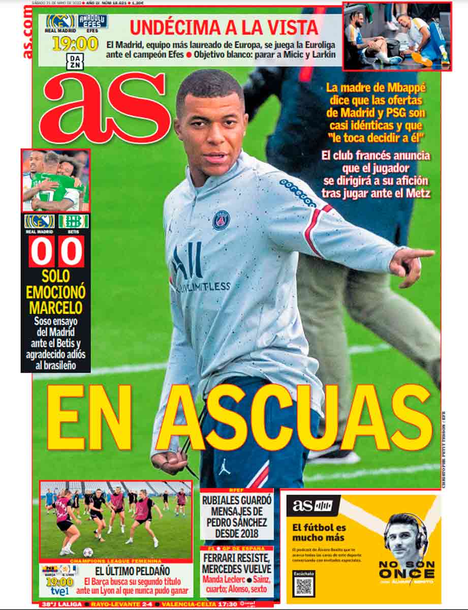 Toda la portada del As para Mbappé y las palabras de su madre, y por ahí en chiquitito, sendas (mínimas) referencias a la final de Belgrado o a la emocionada despedida de Marcelo. Una pena que lo más importante ocupe los huecos menos importantes de la prensa dedicada a lo más importante de las cosas menos importantes. “En ascuas”, reza As, y no sabemos si el diario madrileño se refiere a que las brasas de amorío de Mbappé por el Madrid empiezan a apagarse, a convertirse en rescoldos de un amor no correspondido, así que hemos acudido al Diccionario antiguo para ver su significado preciso: