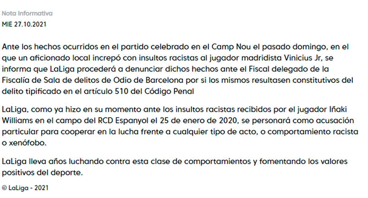 Durante la tarde del día de ayer, la LFP emitió un comunicado informando que la propia Liga procederá a denunciar ante el Fiscal los insultos racistas a Vinícius durante el clásico del Camp Nou.