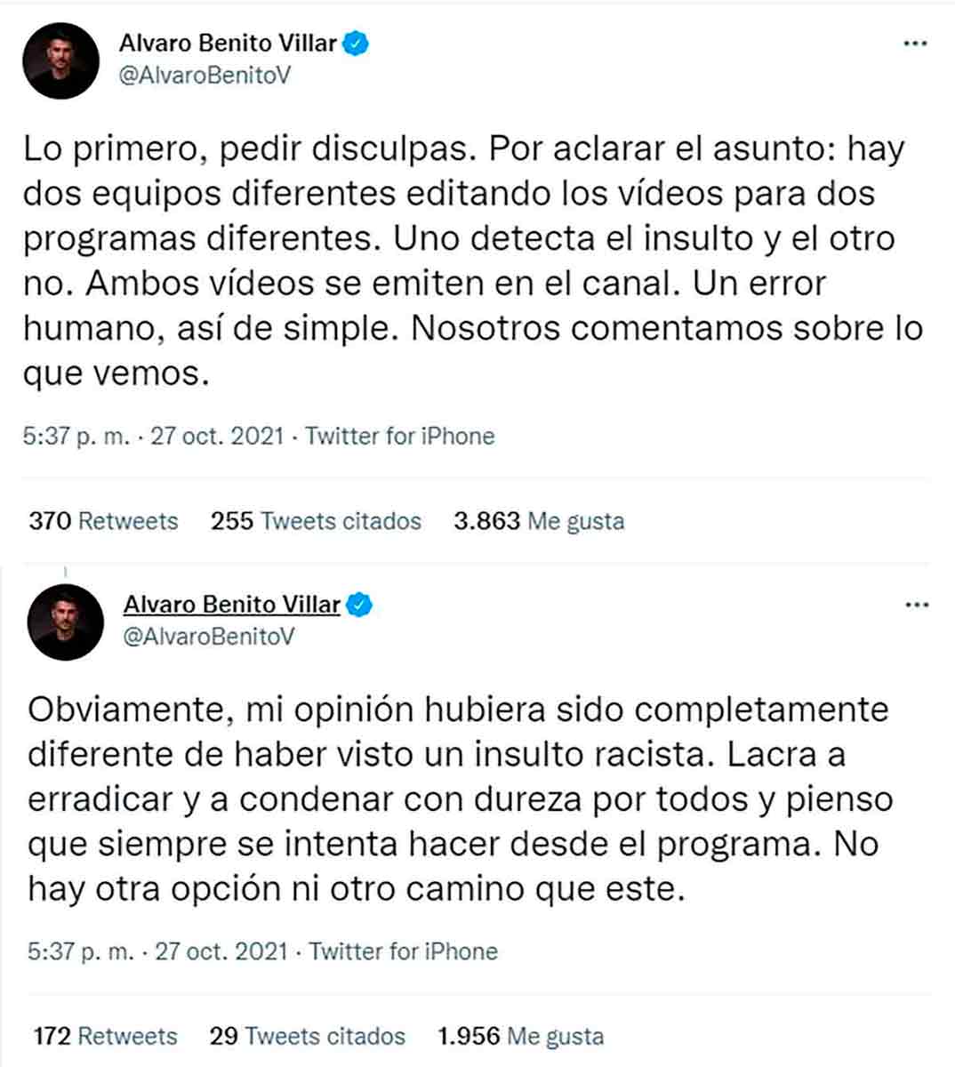 Tras la lógica indignación provocada entre los aficionados, Álvaro Benito tuvo que pedir disculpas por el hecho de que uno de los programas de Movistar sí emitiese el insulto y el otro no solo no lo hiciese sino que, en su lugar, se sacase de la manga una reprimenda pública... a la víctima de los insultos racistas, es decir, a Vinícius, quien por lo visto sonrió demasiado fuerte como respuesta a quien le llamaba “macaco”. “Macaco”, por cierto, es “mono” en portugués. Al muy cafre no le pidas que dé a su hijo una educación aceptable, pero lo del Google Translate lo maneja de cine. No se puede decir que el muy miserable no haga los deberes.