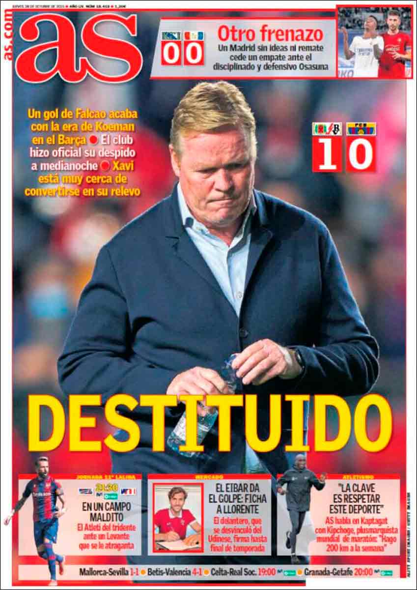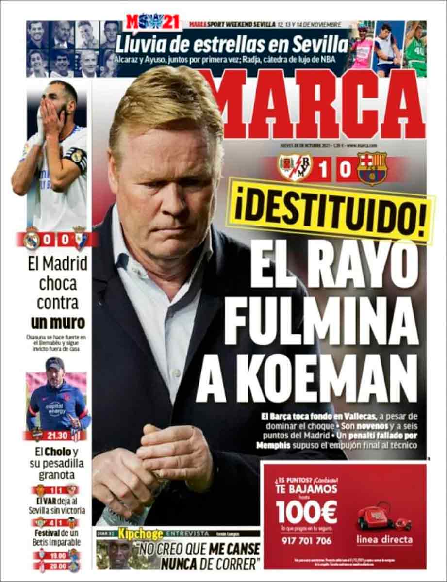 De lo que sí tratan las portadas es la destitución de Koeman como entrenador del Barcelona. Koeman llevaba tiempo siendo una especie de Bruce Willis en el Sexto sentido, solo que el holandés sí sabía que estaba muerto.